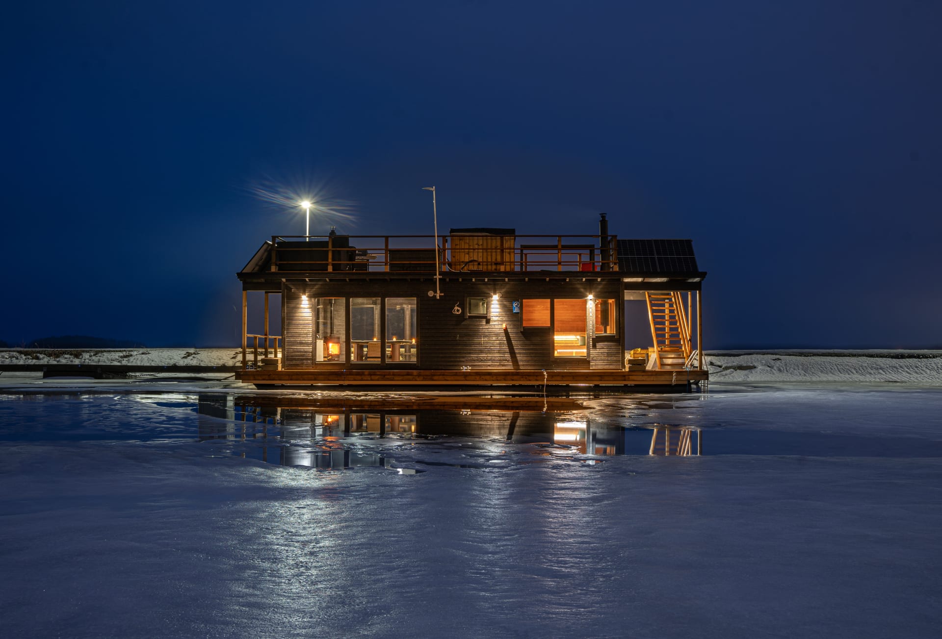 Moderni saunalautta on varusteltu kaikilla mukavuuksilla: tilava sauna, viihtyisä oleskelutila, takka, äänentoisto, suuri näyttö ja avara kattoterassi, jolta avautuvat upeat näkymät järvelle.