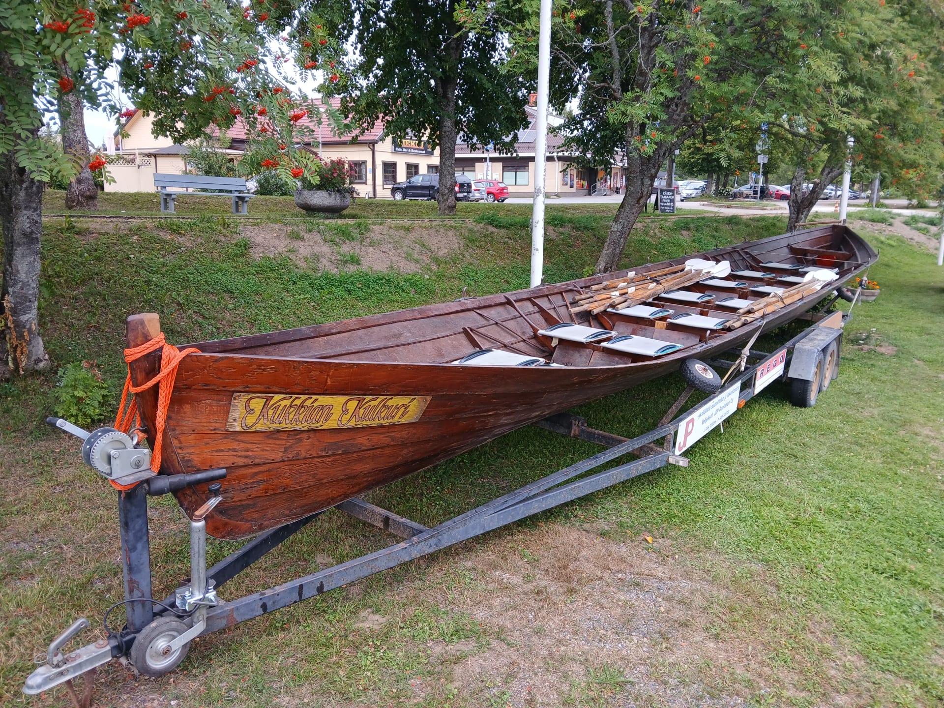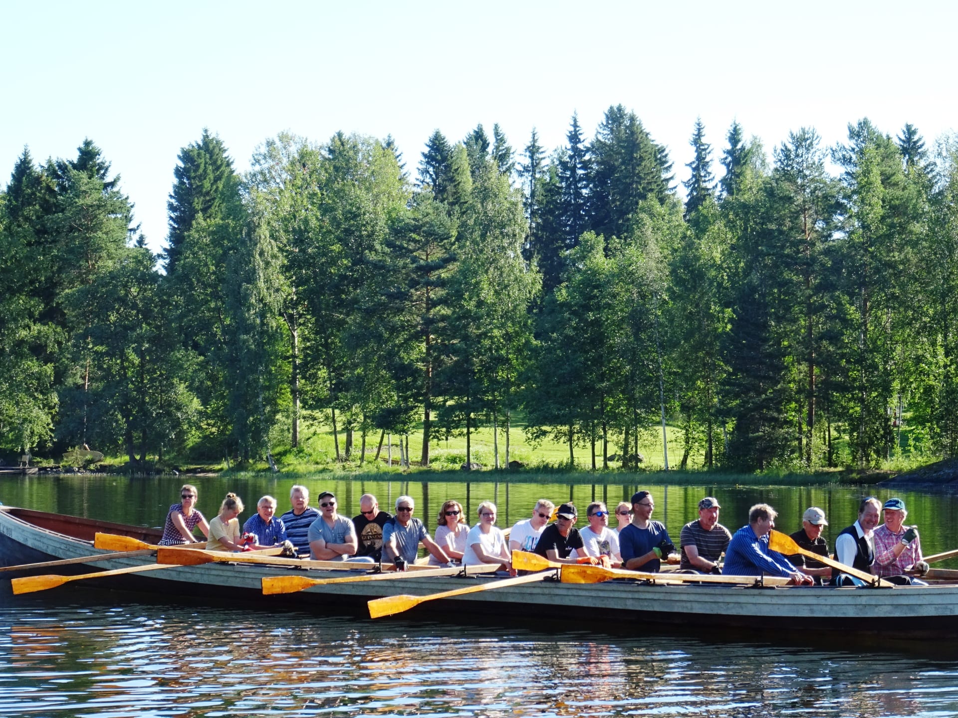 Two traditional long boats, Ahti2 and Aallotar, and the smaller Kulkuri sail on the lake.